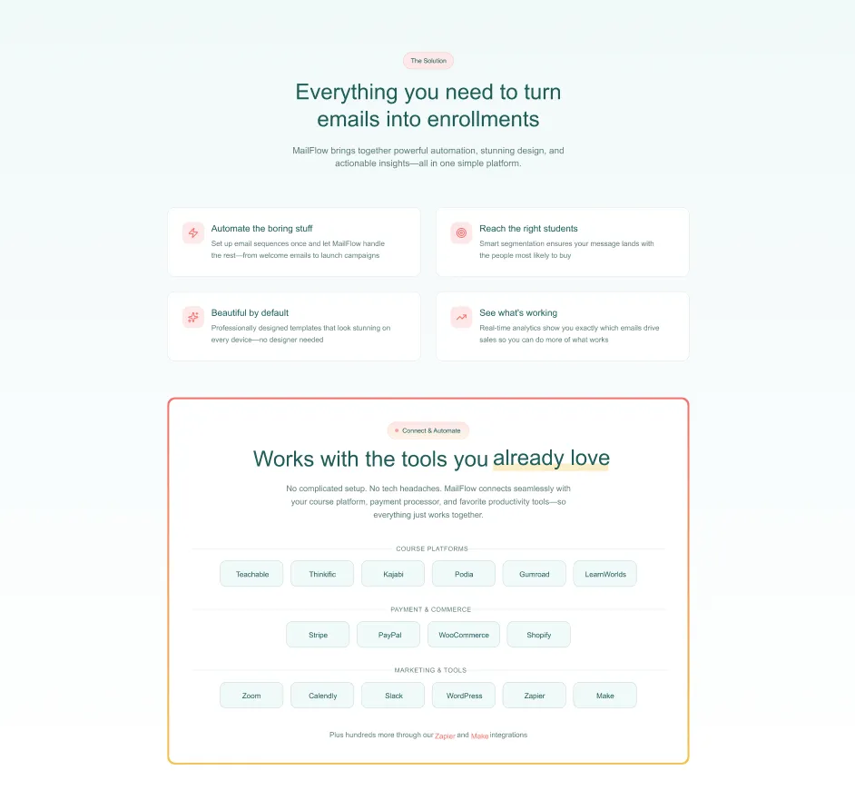 MailFlow integrates seamlessly with Teachable, Thinkific, Kajabi, Podia, and most major course platforms. We also connect with Stripe, Zoom, Calendly, and 1,000+ apps via Zapier.